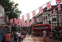 Banbury Cross is fashioned after old England, with phone booths and classic Tudor English architecture. Guest Services windows are located next to the turnstiles of the main entrance gate. A simulacrum of the famous Elizabeth Tower (known colloquially as Big Ben) is the central element of this area. Banbury Cross also includes The Squire's Grill, serving breakfast and lunch, as well as a funnel cake shop, ice cream shop and candy store. The Globe Theatre, a double-sized replica of William Shakespeare's Globe Theatre, is the most prominent attraction in the hamlet. In 2014, the theatre was renovated to once again hold live performances. For many years preceding 2014, the Globe Theatre's entertainment lineup consisted of 4-D films, including Haunts of the Old Country, Pirates 4-D and R.L. Stine's Haunted Lighthouse. Prior to the 4-D films, the theater hosted a variety of live shows including Mark Wilson's World's Greatest Illusions, America on Ice, Hot Ice, Celebrate America and the People's Choice. It currently features an American music show, “American Jukebox: Summer Remix”, showcasing American hits through the decades.