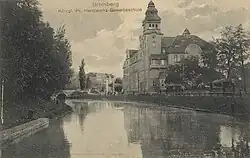In 1772, in the First Partition of Poland, the town was acquired by the Kingdom of Prussia as Bromberg and incorporated into the Netze District in the newly established province of West Prussia. At the time, the town was seriously depressed and semi-derelict.[29] Under Frederick the Great the town revived, notably with the construction of a canal from Bromberg to Nakel (Nakło) which connected the north-flowing Vistula River via the Brda to the west-flowing Noteć, which in turn flowed to the Oder via the Warta.[30] From this period until the end of the German Empire, a large majority of the city's inhabitants spoke German as their main language, and the city would later acquire the nickname "little Berlin" from its similar architectural appearance to the prewar image of the German capital and the work of shared architects such as Friedrich Adler, Ferdinand Lepcke, Heinrich Seeling, or Henry Gross.[4] During the Kościuszko Uprising, in 1794 the city was briefly recaptured by Poles, commanded by General Jan Henryk Dąbrowski,[24] and the local Polish administration was co-organized by Józef Wybicki.[28]