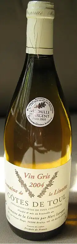 Côtes de Toul exists as white, red and rosé wine, the latter under the designation Vin Gris. Gamay-dominated Vin gris is the most common wine, supplemented primarily by Auxerrois blanc-based white wines and relatively light red wines from Pinot noir.[4]