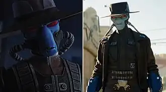 The character's appearance in The Book of Boba Fett has been positively reviewed by reviewers, who argue that it gave the series a singular villain.[38][39] However, Murray Ferguson of Screen Rant argues that the character's physical appearance (including a higher mouth and added chin) represents a decline in quality from Bane's animated appearances.[39] Meanwhile, The A.V. Club's Nick Wanserski stated that the character looks "reasonably good", but some elements "worked better in animation."[38] However, his appearance was praised by Sean Clean of CNET, who called his appearance "terrifying" and compared it to Lee Van Cleef's character Angel Eyes in The Good, the Bad and the Ugly.[40] Similar to the fan edits of Luke Skywalker's appearance in The Mandalorian, a fan edited Bane's live-action appearance in an effort to make it closer to the animated version of the character following perceived audience criticisms of his appearance in live-action.[41][42]