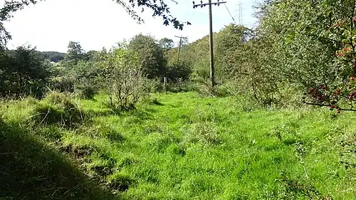 The station was located on the south-western side of the single track line with a single name board 'Calderwoodglen' supported on old rails, a plain wooden fence, one wooden platform surfaced with grit, with a small shelter at the northern end, but with no lighting. It lay to the east of the railway overbridge and a path from the road through an old quarry led to the platform and its shelter. No sidings or goods facilities were present and no signalling.[3]