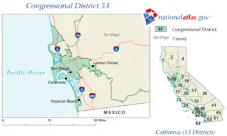 California's 53rd congressional district was a congressional district in the U.S. state of California. It was last represented by Sara Jacobs, who succeeded Susan Davis following the 2020 election. It was eliminated following the 2020 United States redistricting cycle,[1][2] becoming the first congressional seat to be lost after a census in California's history.[3]