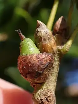 Callirhytis carmelensis, formerly Andricus carmelensis, the mottled acorn gall wasp, is a species of hymenopteran that induces galls on the acorns of coast live oaks and interior live oaks in California in North America.[1][2] The purple or spotted green gall forms where the acorn attaches to the tree and often prevents normal development of the nut.[2] The gall also produces a honeydew secretion that is attractive to other insects.[2] This wasp is generally considered uncommon.[2]