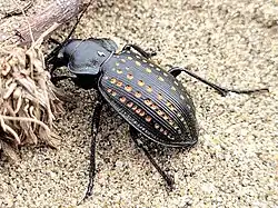Calosoma calidum, the fiery hunter, is a species of ground beetle in the subfamily of Carabinae. It was described by Johan Christian Fabricius in 1775. It occurs throughout Canada and the northern and eastern parts of the United States. About 19mm to 27mm long, this beetle is black with rows of red or gold spots or pits on its elytra. It can be found in fields and disturbed habitats. Larvae and adults prey upon moth caterpillars.[1][2][3]