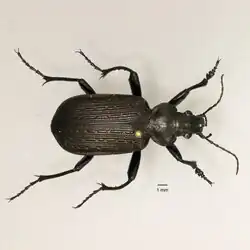 Calosoma sayi, also known as "Say's caterpillar hunter or "Black Caterpillar Hunter",[1] [2] is a species of ground beetle of the subfamily Carabinae.[3] It was described by Pierre François Marie Auguste Dejean in 1826.[3] A large, lustrous black beetle found throughout the United States, its habitat is fields and disturbed areas. About 25mm to 28mm long, its grooved elytra have rows of metallic dots or pits. Said pits are smaller than many other Calosoma, and are ruby red. Both larvae and adults prey upon other larvae and pupae, specifically those of grubs, flies, and lepidoptera.[2]