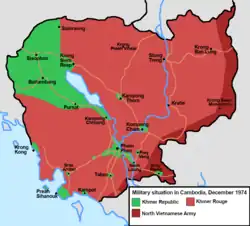 In the wake of the coup, Lon Nol did not immediately launch Cambodia into war. He appealed to the international community and to the United Nations in an attempt to gain support for the new government and condemned violations of Cambodia's neutrality "by foreign forces, whatever camp they come from."[76] His hope for continued neutralism availed him no more than it had Sihanouk. On 29 March 1970, the North Vietnamese had taken matters into their own hands and launched an offensive against the now renamed Forces Armées Nationales Khmères or FANK (Khmer National Armed Forces) with documents uncovered from the Soviet archives revealing that the offensive was launched at the explicit request of the Khmer Rouge following negotiations with Nuon Chea.[7] The North Vietnamese overran most of northeastern Cambodia by June 1970.[8]