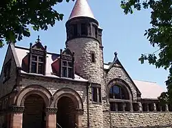 Porter Square is about a mile north on Massachusetts Avenue from Harvard Square, at the junction of Massachusetts and Somerville Avenues.[59] It includes part of the city of Somerville[60] and is served by the Porter Square Station, a complex housing a Red Line stop and a Fitchburg Line commuter rail stop.[61] Lesley University's University Hall and Porter campus are in Porter Square.[60]