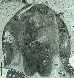 Cambroraster is an extinct monotypic genus of hurdiid radiodont, dating to the middle Cambrian, and represented by the single formally described species Cambroraster falcatus.[1] Hundreds of specimens were found in the Burgess Shale, and described in 2019.[2] A large animal (for its era) at up to 30 centimetres (12 in) (but not as long as Titanokorys at 50 centimetres (20 in)), it is characterized by a significantly enlarged horseshoe-shaped dorsal carapace (H-element), and presumably fed by sifting through the sediment with its well-developed tooth plates (oral cone) and short frontal appendages with hooked spines.[1] Nicknamed the "spaceship" fossil when first found, for the way its dorsal carapace resembles the fictional Millennium Falcon, the specific epithet falcatus in its scientific name is a nod to that resemblance.[1][3][4]