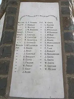 Face 5 of the British memorial on Spion Kop lists the names of the soldiers from the Cameronians who died at the Battle of Spion Kop during the Second Boer War.[37] The Cameronians War Memorial in Kelvingrove Park, Glasgow by Philip Lindsey Clark, unveiled on 9 August 1924, depicts men of the regiment manning a Lewis gun.[38] A monument commemorating both the founding of the regiment by the Earl of Angus in 1689 and its disbanding in 1968 can be found at Douglas, South Lanarkshire.[39] Also within the village is a statue of the Earl of Angus to commemorate the bicentenary of the raising of the regiment.[40]