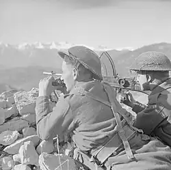 A Bren gun team from the 2nd Battalion, Cameronians (Scottish Rifles), 5th Division, take up a position high up in the mountains, Italy, 21 November 1943.