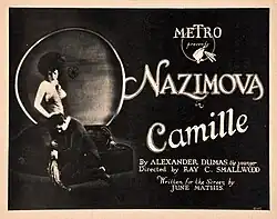 Camille is a 1921 American silent drama film starring Alla Nazimova as Marguerite and Rudolph Valentino as her lover, Armand. It is based on the play adaptation La Dame aux Camélias (The Lady of the Camellias) by Alexandre Dumas, fils, which was first published in French as a novel in 1848 and as a play in 1852. Camille is one of numerous screen adaptations of Dumas, fils' story.[1][2] The film is set in 1920s Paris, whereas the original version takes place in Paris in the 1840s. It has lavish Art Deco sets; Rudolph Valentino later married the film's art director, Natacha Rambova.