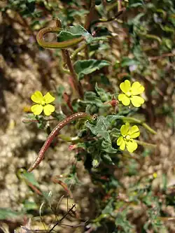 Camissonia pubens is a species of evening primrose known by the common name hairy suncup. It is native to the desert and steppe of western Nevada and eastern California. It is an annual herb covered in glandular hairs generally made up of one or more erect, slender stems up to a third of a meter tall. The leaves are up to about 4 centimeters long and are lance-shaped with wavy, toothed edges. The nodding inflorescence produces flowers with yellow petals each a few millimeters long and sometimes dotted with red near the bases. The fruit is a straight or coiling capsule up to 5 centimeters long.