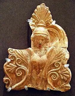 - Cladding tiles: On the upper border, where the tile forms a smooth edge, there was decoration with an egg and dart pattern and the lower border is decorated with Lotus, palmettes, and anthemia. The lower edge follows the contour of the decorative pattern. There were three or four holes in each tile, through which tiles were tied to the wall.[14]