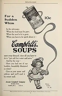 The soup is said to have reminded Warhol of his mother, Julia, who served it to him regularly while raising him during the Great Depression, as Czech immigrants in a Pennsylvania coal mine town.[105] At times, the family could not even afford to splurge on Campbell's Soup and ate soup made from ketchup.[106][107] It is regarded as doubtful that the Warhols had Campbell's Soup often, since it was marketed as an upscale item, and Julia was a soupmaker who could cook from scratch.[97] It wasn't until the late 1950s that canned soup was targeted toward the working class.[108]