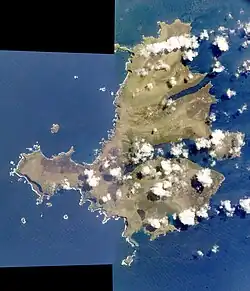 Campbell Island is an extinct alkaline shield volcano that marine erosion has worn down into its present shape.[37][38] The volcano has been extinct for some six million years, and glacial ice cover prevented vegetation from growing on the island until approximately 15,000 years ago.[39] Basalt, hawaiite, mugearite and trachyte are the dominant volcanic rocks comprising Campbell Island. They were erupted between 6.5 and 11 million years ago during the Miocene epoch.[38] The island is considered to be part of the submerged continent of Zealandia.
