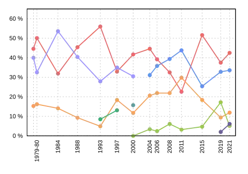 New Brunswick results in federal elections are divided among geographical and linguistic lines: The Liberals fare better in the predominantly francophone eastern and northern sections of the province, while the anglophone south and west has historically tended to favour the Conservatives. In 1993, Saint John was one of only two ridings in the country to go Progressive Conservative, electing Elsie Wayne. The Conservatives improved their seat count in each election from 2004 to 2011, until the Liberals swept New Brunswick (along with the rest of Atlantic Canada) in the 2015 election. In 2019, the Conservatives were able to regain 3 seats, while the Greens made history by picking up Fredericton, their first seat outside B.C. Their vote percentage almost quadrupled to 17%, replacing the NDP as the main third party. In 2021 though, support for the Greens collapsed down to 5% with their sole MP having crossed the floor to the Liberals and being re-elected as such. The Liberals widened their popular support but lost one seat to the Conservatives.