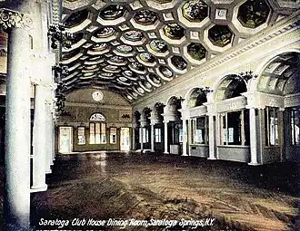 After Morrissey's death in 1878, ownership passed to Albert Spencer and Charles Reed. In 1893, Richard Albert Canfield took a partnership in the Saratoga Clubhouse, and bought it outright in 1894 for $250,000.[10][11] ^nventory Nomination Form Canfield invested an estimated $800,000 in enhancing the building and the grounds of Congress Park to bring them up to the standards of the top European establishments. In 1902-3, he added a sumptuous dining room to the back of the Clubhouse fitting it with stained glass windows and an early form of air conditioning. He ordered marble statuary for the Italian gardens in the northeast corner of Congress Park. The elegant atmosphere made the cream of society feel welcome to bet their money on the Clubhouses's many games of chance. Canfield was recognized as the King of the Gamblers and Saratoga Springs was seen as the American Monte Carlo. Canfield kept the Clubhouse going until 1907. The clientele during this period included not only members of wealthy families like the Whitneys, Vanderbilts and J. P. Morgan's, but gambling legends like Diamond Jim Brady and John Warne "Bet-a-Million" Gates, and prominent entertainers like Gate's girlfriend Lillian Russell and impresario Florenz Ziegfeld.[4]