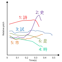 The relative pitch of the tones varies with the speaker; consequently, descriptions vary from one source to another. The difference between high- and mid-level tones (1 and 3) is about twice that between mid- and low-level (3 and 6): 60 Hz to 30 Hz. Low-falling (4) starts at the same pitch as low-level (6), but then drops; as is common with falling tones, it is shorter than the three level tones. The two rising tones, (2) and (5), both start at the level of (6), but rise to the level of (1) and (3), respectively.[12]
