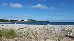 Along the Cabot Trail between the park headquarters at Ingonish Beach and Ingonish, a 402 Ma old Early Devonian granodiorite is exposed, the Cameron Brook Pluton, while the Keltic Lodge, on Middle Head, sits on a 493 Ma old Early Ordovician granite and a 550 Ma old Neoproterozoic diorite.[19] The beach in front of Freshwater Lake is a classic shingle beach, a barrier beach with boulders well rounded and polished from wave action. Glacial debris is evident along the trail at the north end of the lake. A similar bar cuts across Ingonish Harbor.[17]: 90 [20][21]