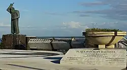 Following the direction of the first, the second square is situated between Luis Muñoz Rivera Avenue and the North Atlantic Ocean next to the grounds of the San Cristóbal Fortress in the historic quarter of Old San Juan. Perched over the northern cliffs of San Juan Islet with a semicircular plan and marble finishes throughout, the square is known as the Plaza San Juan Bautista (San Juan Bautista Square) after John the Baptist, the patron saint of San Juan, the capital municipality of Puerto Rico, which was first named San Juan Bautista ("Saint John Baptist") or San Juan ("Saint John") by Christopher Columbus, when the European explorer discovered the main island during his second voyage in 1493. In the center of the square, lies a large, abstract bronze sculpture of John the Baptist surrounded by a low-lying, semicircular pedestal containing the coats of arms of the 78 municipalities comprising Puerto Rico.