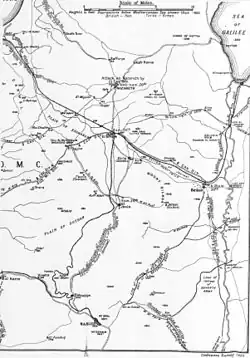 During the unsuccessful attack of the 5th Cavalry Division on Nazareth in the early morning of 20 September, the commander of the Yildirim Army Group commanding three Ottoman armies, Generalleutnant (comparable to a British Major General) Otto Liman von Sanders escaped to Damascus, travelling via Tiberias, Samakh and Deraa.[4][5][6] He alerted the garrisons he passed to the advance of the EEF and ordered the establishment of a rearguard line. The line was to run from Deraa down the Yarmuk River Valley, across the Jordan River and west to Samakh, around the shore of the Sea of Galilee to Tiberias and northwards to Lake Huleh. Two main roads and the railway lines to Damascus, would be protected and time gained for the development of the defence of Damascus, if the garrisons were not defeated.[7][8][9] Von Sanders and three senior Yildirim Army Group staff officers reached Tiberias during the afternoon of 20 September.[4]