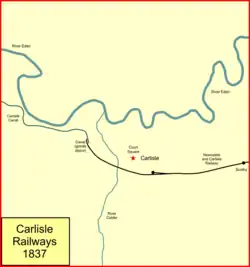 The original intention had been to connect directly to the Carlisle Canal, but this was delayed, and the connection to the canal became a "branch"; the first traffic was grain, which passed on the branch on 25 February 1837, and it was fully opened on 9 March 1837.[1][2][7][8]