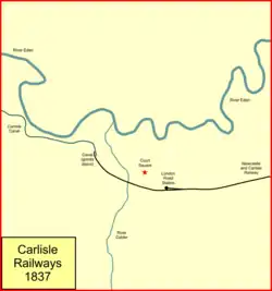 The Lancaster and Carlisle Railway was incorporated on 6 June 1844, and it opened its line as far as Carlisle on 17 December 1846, from which date a continuous line between London and Carlisle was available. The issue of the L&CR station at Carlisle was not yet settled, so the first L&CR trains used the Newcastle and Carlisle Railway's London Road station, reached by a sharp south-to-east curve that had been authorised on 21 June 1845, and which (as for the M&CR trains) required a backshunt to enter the station. The train service was not intensive so for the time being this was not a great operating difficulty. However, this was far from convenient for the future Anglo-Scottish trunk route that was clearly forming, and the question of the station at Carlisle was to create a serious difficulty.[2][14][15][16]