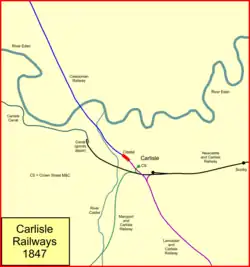 The London Road terminus faced eastwards, so that use of it by M&CR trains involved a backshunt. The cramped Water Lane station was only a temporary measure, and the M&CR had acquired land at Crown Street for their intended permanent terminus. Unfortunately the parliamentary bill for that was rejected on a technicality in the 1843 session. When it was resubmitted in 1844, it was considered together with the bill for the Lancaster and Carlisle Railway; both bills were passed (on 6 June 1844) as the Maryport and Carlisle Railway Act 1844 (7 & 8 Vict. c. xxxvi) and the Lancaster and Carlisle Railway Act 1844 (7 & 8 Vict. c. xxxvi).[11] and serious difficulties later arose. The L&CR and the M&CR schemes both required facilities for a terminus, and for some time it proved impossible to negotiate a mutually acceptable arrangement.[1][2][7][9]