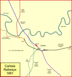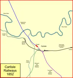 On 8 August 1852 the Maryport and Carlisle Railway opened a west-to-north curve from Forks Junction to Citadel, enabling direct access to Carlisle without reversal; from this time goods traffic also used this new connection. The new approach crossed the Canal line on the level; the M&CR were required to appoint a person to make signals at the passage of trains.[1][11]