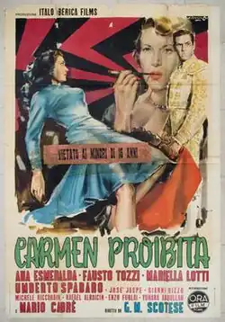 Carmen (Italian: Carmen proibita, Spanish: Siempre Carmen) is a 1953 Italian-Spanish drama film directed by Giuseppe Maria Scotese and starring Ana Esmeralda, Fausto Tozzi and Mariella Lotti. It is based on Prosper Mérimée's novel Carmen.[1]