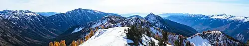 Carne Mountain is a 7,080+ ft (2,160+ m) double-summit mountain located in the Entiat Mountains, a sub-range of the North Cascades, in Chelan County of Washington state.[4] Carne Mountain is situated on the boundary of the Glacier Peak Wilderness, on land managed by the Okanogan–Wenatchee National Forest. Its nearest higher neighbor is Chilly Peak, 1.4 miles (2.3 km) to the northeast, and Ice Box is set 1.7 miles (2.7 km) to the north. Precipitation runoff from the mountain drains east into Rock Creek, or west into Phelps Creek, both tributaries of the Chiwawa River. This peak can be accessed via the 3.7-mile Carne Mountain Trail which gains 3,600 feet of elevation. The mountain once had a fire lookout building on its south peak.[3] Views from the top include Bandit Peak, Brahma Peak, Buck Mountain, Fortress Mountain, Chiwawa Mountain, Mount Maude, Ice Box, and Chilly. This mountain was named by Albert Hale Sylvester for English clergyman W. Stanely Carnes.[5] This feature is pronounced "karn".