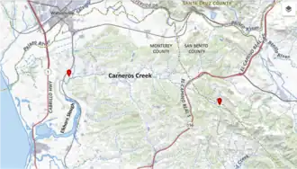 The source of the mainstem is at 357 feet (109 m) elevation on the western slope of the northern Gabilan Range, east of Highway 156/101, from whence it flows west to the highway where it is met by an eastern fork which begins further east in the Gabilan Range in San Benito County. The eastern fork flows westward along Rocks Road east of, then around the north flank of, Pinacate Peak[6] until it crosses back into Monterey County and under Highway 156/101, joining the Carneros Creek mainstem in the Cañada de la Carpinteria.[2][1] From its confluence with the eastern fork, the mainstem Carneros Creek flows westward along San Juan Road, Tarpy Road, then Hall Road before joining Elkhorn Slough at the southern boundary of the historic Mexican land grant Rancho Bolsa de San Cayetano, near Las Lomas.[7]