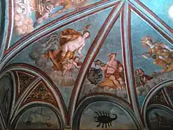 The Zodiac Room consists of fourteen lunettes representing twelve signs of the zodiac, since architect Portaluppi, in 1922, enlarged the room by knocking down the oblique windowed wall, gaining space to decorate it with two more lunettes, inside which inscriptions can be distinguished: the first is the motto 'Faire sans dire' and the other by the letters 'H and J' indicating the initials of Hector (Ettore Conti) and Joanna (Giannina Casati, his wife). The Zodiac Room is testimony to architect Portaluppi's skill in mixing what is authentic as it is truly ancient, and what is not. It can be seen that the wall to the west is heavily worked with frequent retouches, while the walls to the east, restored by the architect and Conti in 1922, are authentic.[6]