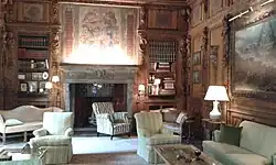 After the Sala dello Zodiaco one proceeds to the study of Ettore Conti, a great entrepreneur of the Italian electrical industry who entered the residence in the early 20th century. In the room, which directly overlooks the garden of Leonardo's vineyard, there is a fireplace surrounded by inlaid wooden walls, where the coats of arms and insignia resulting from the alliance of the marriage between Christina of Denmark and Francesco Sforza can be distinguished. The figures, on the wall above the fireplace, represent: the three crowns Sweden, the eagle and the «bison» the Visconti and the Sforza (but the former also the Empire), the golden lion Norway and the golden dragon the King of Vendi. The walls covered in 18th-century wood panelling contain the volumes of a sizeable library.[7]