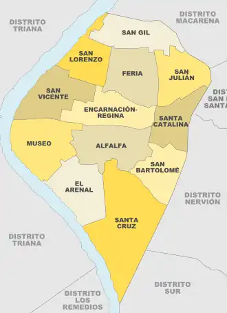 It has twelve neighbourhoods. Of these, El Arenal on the riverfront was the port of Seville until the Guadalquivir silted up in the 17th century,[2] while the neighbouring Santa Cruz neighbourhood was a Jewish quarter until the Spanish Inquisition.[3]