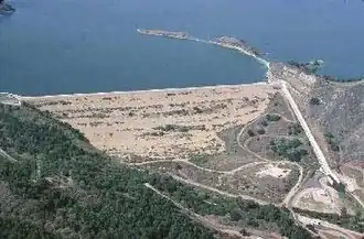 Casitas Dam is an earthfill dam across Coyote Creek that forms Lake Casitas in Ventura County, California near Oak View, California. The dam is located two miles (3 km) above the junction of Coyote Creek and the Ventura River. Water from the Ventura River is diverted to Lake Casitas as well. The 334 ft (102 m) structure was built by the U.S. Bureau of Reclamation. It is a key part of the Ventura River Project. Construction was completed in 1959 and was strengthened in June–December 2000 as a seismic improvement to help withstand earthquakes greater than 6.5. Lake Casitas has a 254,000 acre⋅ft (313,000,000 m3) storage capacity and provides irrigation and municipal uses for the Casitas Municipal Water District.