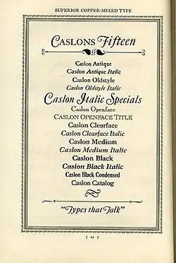- ^ Specimens of Type. London: H.W. Caslon & Co. 1915. Retrieved 19 August 2015.