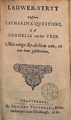 During the 17th century, it was quite common for poets to create works together, going back and forth in friendly, poetic responses of one topic or another. Between November 1662 and January 1663, Catherina, and her childhood friend, Cornelia van der Veer, wrote a series of poems together, that was published in 1665. It was called the Battle for the Laurels between Catherina Questiers and Cornelia van der Veer. It included ten poems in which the two attempted to battle to see who was more deserving of the poet's laurel wreath, which was a classical tribute to eminent poets. In the spirit of good-nature, the battle was deemed a tie. In total, Catherina contributed 31 poems, while Cornelia contributed 51. There were also other poems written by friends that they included in the book, bringing it to a lengthy 375 page, limited edition.[3]