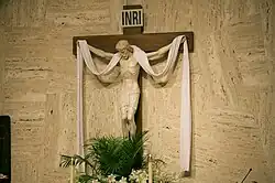 The sanctuary wall is polished buff travertine. The steps and raised surfaces in the sanctuary are of contrasting walnut travertine. The altar is a single block of polished marble weighing 7000 pounds. Within the altar are relics from Saint Clement, Saint Irenaeus, and Saint Aurelius. The sanctuary itself is oval-shaped and was designed specifically for ceremonies in which the bishop presides and for post-Vatican II liturgy. The cathedra or bishop's throne sits immediately beneath the bishop's coat of arms, which hangs on the sanctuary wall. The crucifix with a corpus of walnut travertine is suspended from the wall. The corpus is 5 feet (1.5 m) tall and weighs over 450 pounds (200 kg).