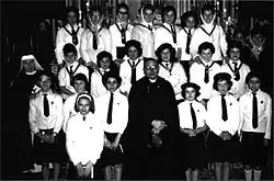 A Catholic women's youth association choir in Mascara, Algeria at a reception ceremony for young cadets from the school of Trinitarian sisters: a Catholic religious order founded in 1194 in Cerfroid, France by two French Saints, Jean de Matha and Saint Felix de Valois. This photo is dated 8 December 1961.