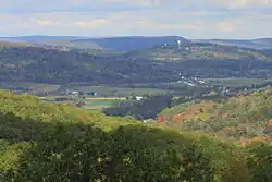The general geomorphology of the viticultural area corresponds to distinguishable geologic features which define a valley and an upland area. The valley lies between low mountains that rise to an elevation of about 2,000 feet (610 m) and belong to. the easternmost fringe of the Appalachian Mountains. The mountains surrounding the valley are formed of sedimentary, metamorphic sedimentary, and igneous rocks while the valley is composed almost entirely of green schistose rock, a metamorphosed basalt. The valley area is distinguished by the surrounding uplands. The upland areas are distinguished from surrounding areas by adjacent limestone valleys.
