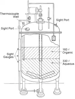 Cecil Kelley was a 38-year-old chemical operator with 11 years of experience; he had spent more than half of this time at LANL, where one of his duties was to operate a large, 1 m3 capacity, stainless-steel mixing tank. The tank contained residual plutonium-239 (239Pu) from other experiments and applications, along with various organic solvents and acids in aqueous solution for the purpose of recovery and reuse. In pure form and under normal temperature and pressure, plutonium is a solid, silvery metal. It tarnishes quickly when exposed to air and readily dissolves in concentrated hydrochloric, hydroiodic, and perchloric acids,[2] as well as others. On the day of the accident, the mixing tank was supposed to contain a "lean" concentration of dissolved plutonium (≤0.1 g of plutonium per liter of solution) in a bath of highly corrosive nitric acid and a caustic, stabilized, aqueous, organic emulsion.[3] The concentration of plutonium in the mixing tank was nearly 200 times higher than Kelley anticipated, however, as a result of at least two improper transfers of plutonium waste to the tank[4] from undetermined sources. Also, the plutonium was distributed unevenly, with the upper layer of solution containing especially high concentrations, amounting to a total of >3 kg of plutonium, dangerously close to criticality. When Kelley switched on the mixer, a vortex began to form. The denser aqueous layer within the tank was forced outward and upward forming a "bowl", and the less dense, plutonium-rich layer was drawn toward the vessel's center.[5]