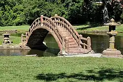 From 1936 to 1938, Dionicio Rodriguez, a Mexican builder and artist, built six pieces in concrete at Cedar Hill, most using a faux bois technique to make them resemble wood. He built two footbridges, a bench, a table in a pergola, a hollow "tree trunk", and an Annie Laurie Wishing Chair, also in a pergola.[4]