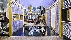 The seasons Ski lodge-themed house design was revealed through the series social media accounts and entertainment news websites on January 28, 2022.[16][17][18] The entranceway to the house was designed around the Swiss Alpines and features a crystal chandelier that has three-hundred thousand illuminated beads.[19] A living room houses a mid-century firepit in the center of a curved couch and posters advertising Switzerland landmarks.[20] Three bedrooms were designed around Ski patrol, a Cuckoo clock, and Chocolate.[21] The Ski patrol bedroom has a Saint Bernard sign above a barrel of brandy, walls of stacked river stones, and an accent wall full of skis; the Cuckoo clock room has a wall clock with a nine-foot face, an "imposing wooden cuckoo", and other various time-keeping devices; the chocolate-themed bedroom features Swiss chocolate bar headboards, bubblegum rugs, and walls with LED-lit artificial chocolate.[21] The kitchen houses an overhead mural of the Northern lights and an attached dining room features a Saarinen-inspired table.[22] A spiral staircase that has been featured in the house since the sixth season of the civilian version in 2005, and throughout the first two seasons of the celebrity version, has been replaced with a three-landing staircase.[22] On the second floor, the upstairs lounge was designed around a gondola while the Head of Household bedroom parallels an Ice palace.[23] A sauna and gym have also been added to the house.[19]