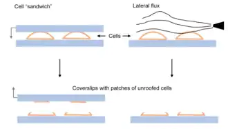 The most common processes of cell unroofing. (left) Sandwich of two cells between two coverslips. (right) Lateral flux of medium allows to break the cells.