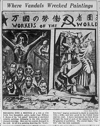 On February 11, 1933, members of the LAPD Red Squad raided and vandalized artworks at the John Reed Club, where leftist artists were exhibiting art to show support for the Scottsboro Boys. After an attorney representing the club attempted to press charges against Squad leader Red Hynes, a grand jury refused to hear his evidence.[55]