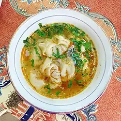 Tea is the most popular beverage. Green tea with cream is more common in Kyrgyz cuisine, while black tea is more common in Kazakhstan and Uzbekistan.[7] A chaikhana is a Central Asian teahouse where people gather to socialize over tea. Traditional dishes are served like shorpo (soup), shashlik (grilled meats), mastoba, manty, pilov and samsa.[2]