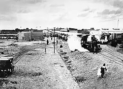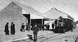 On 11 November 1888, a line 70 km long between Trelew and the quay in Puerto Madryn was opened. It included the first telephone line of the region. Journey time (that were made on horseback) reduced from 20 hours to only 2 hours in train.[2] From Trelew the line was extended 50 km to Gaiman on 31 December 1908 and from there to Dolavon on 12 October 1915. In 1910 a 450-mt. length dock was opened in Puerto Madryn. The railway station would be opened three years after.[3]