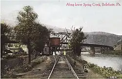 After passing through Bald Eagle Mountain in the water gap of Fishing Creek, the railroad ran southwest along the open and relatively level Nittany Valley towards Bellefonte. The main line crossed and connected with the Nittany Valley Railroad about three miles east of Bellefonte. As it approached that town, it swung west-northwesterly and descended along a ravine through Armor Gap to Spring Creek, then turned south to follow the east bank of Spring Creek into the center of Bellefonte. The road's enginehouse was located north of Bellefonte near the creek; an interchange with the PRR, which had a spur to the American Lime and Stone Company's plants in Armor Gap, was also located in the vicinity.[5][12]