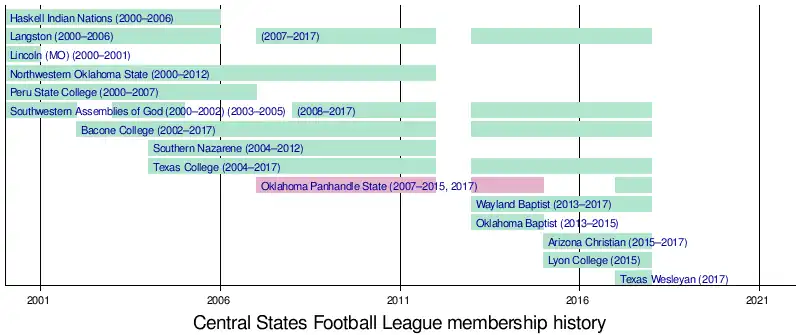 The Central States Football League (CSFL) was a college athletic conference affiliated with the NAIA. Member institutions were located in Oklahoma, Texas, Arkansas and Arizona and competed only in football. The conference was established in 2000 and its charter members included Haskell Indian Nations University, Langston University, Northwestern Oklahoma State University, Southwestern Assemblies of God University, and Peru State College. In 2017, the Sooner Athletic Conference, which served as the primary conference for the majority of the CSFL's membership decided to sponsor football beginning in 2018. As a result the conference's membership shifted to that conference.[1]